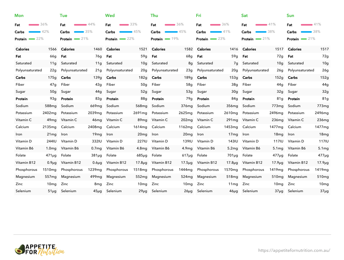 • 7-Day Meal Plan: Structured with 3 main meals and 2 snacks per day, supporting fullness, digestive comfort, and stable blood sugar.
