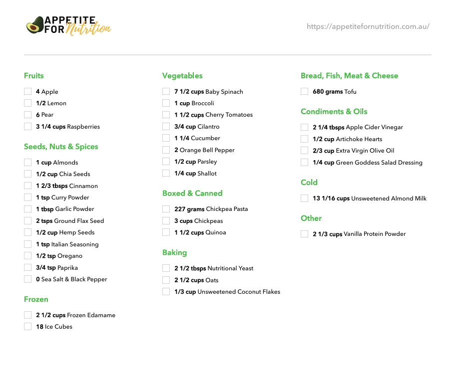 • Shopping List: Organised by produce, pantry, fridge, and freezer categories for easy grocery planning.